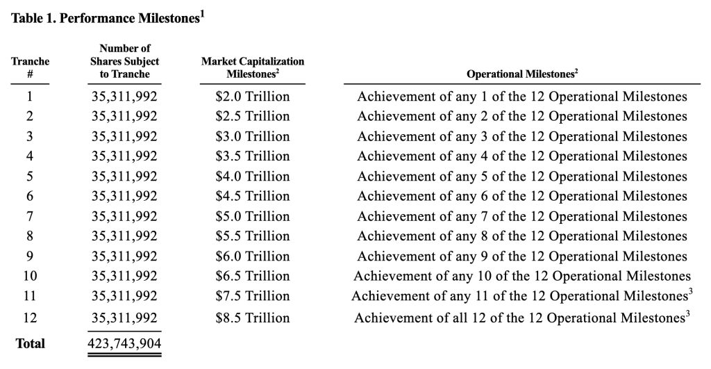 Apart from this, Tesla’s operating profit must also grow from $17 billion to $400 billion annually. Musk must also lead the company to several product-related milestones, such as 20 million cumulative vehicle deliveries, 10 million Full Self-Driving subscriptions, 1 million Tesla Bots, and 1 million operating Robotaxis.