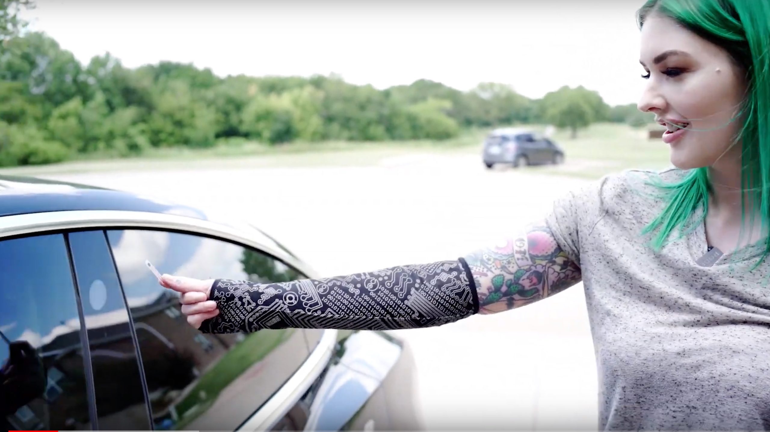 - The Tesla Model 3 valet key card chip location in Amie DD’s arm. | (Image: Amie DD/YouTube)