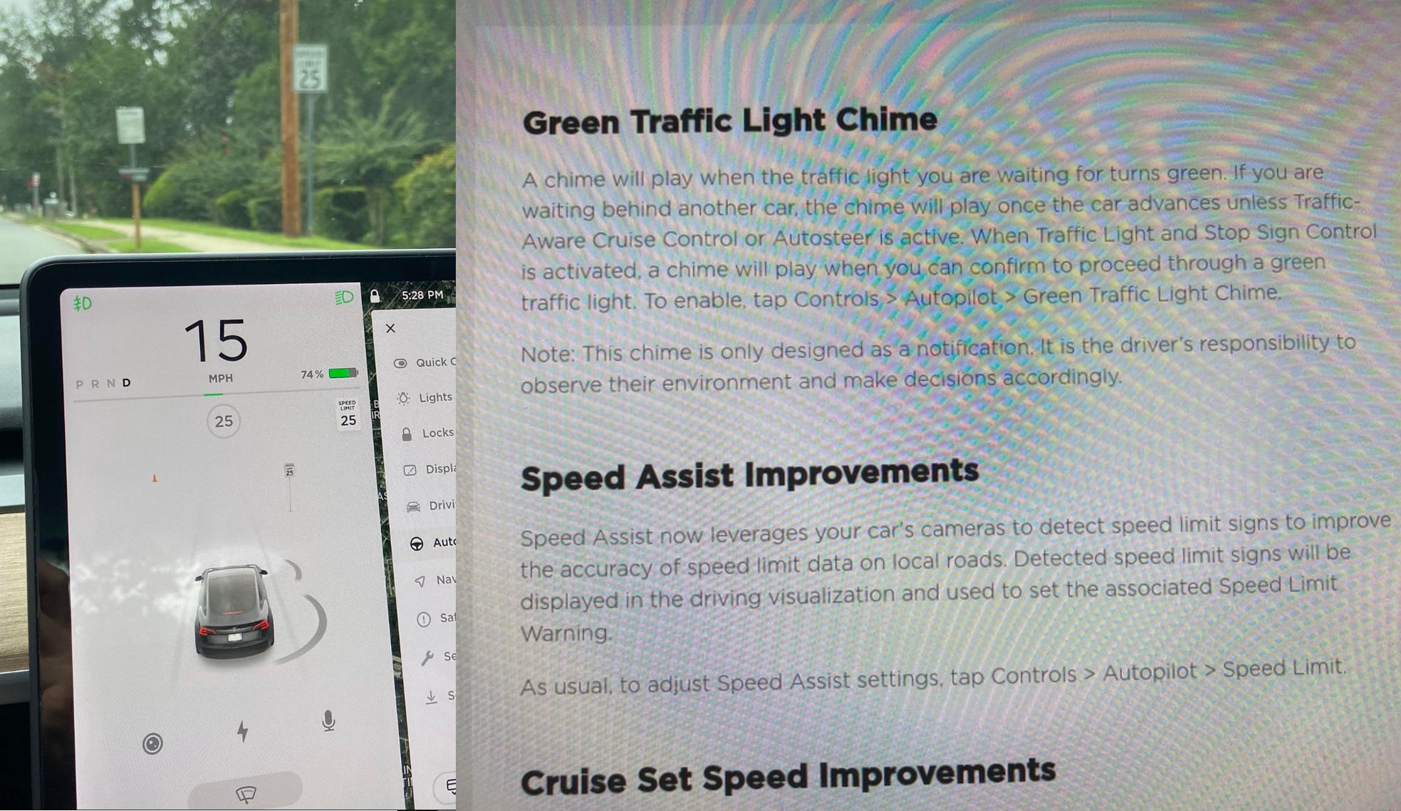 “Speed Assist now leverages your car’s cameras to detect speed limit signs to improve the accuracy of speed limit data on local roads. Detected speed limit signs will be displayed in the driving visualization and used to set the associated Speed Limit Warning.