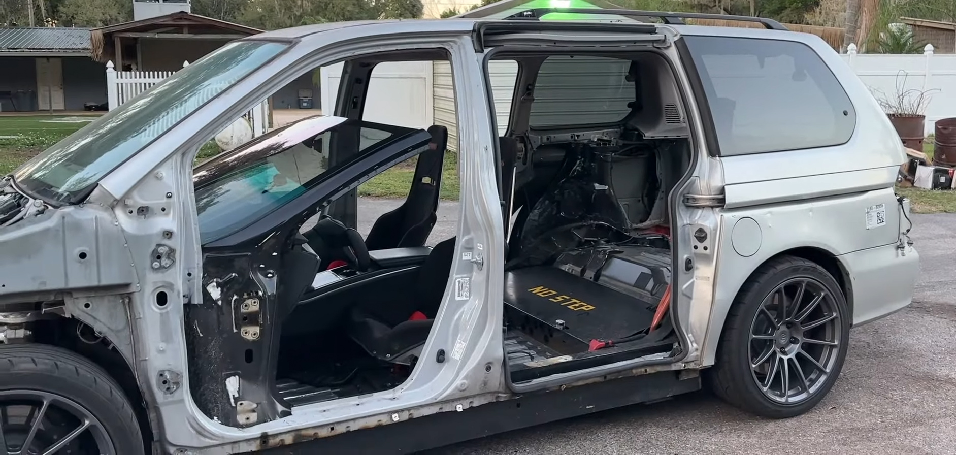 YouTube channel BoostedBoiz is making another major change by chopping off what little remained of the Plaid and dropping a 2001 Honda Odyssey body onto what’s left to create the “ultimate sleeper.”