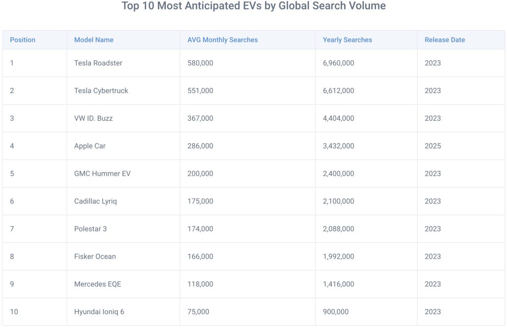 Interestingly, the EVs that followed the Tesla Roadster and the Cybertruck was a rather eclectic mix of electric cars. Behind the Cybertruck, for example, was the Volkswagen ID. Buzz, which saw 4,404,000 global searches; the very-much-still-a-rumor Apple Car, which saw 3,432,000 global searches, and the 2023 GMC Hummer EV, which saw 2,400,000 searches worldwide.
