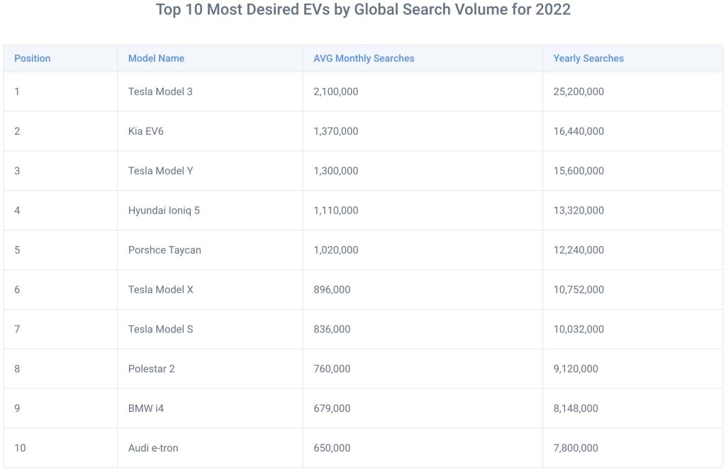 The firm’s study found that overall, the Tesla Roadster has been searched a whopping 6,960,000 times in 2022. That’s an average of 580,000 times per month. This is quite impressive because the new Roadster is not even out yet, and it’s been years since its initial unveiling. While the Roadster would likely be a vehicle that is not mass manufactured anywhere close to the volumes of the Model 3 and Model Y, it is nonetheless an EV that captures the imagination.