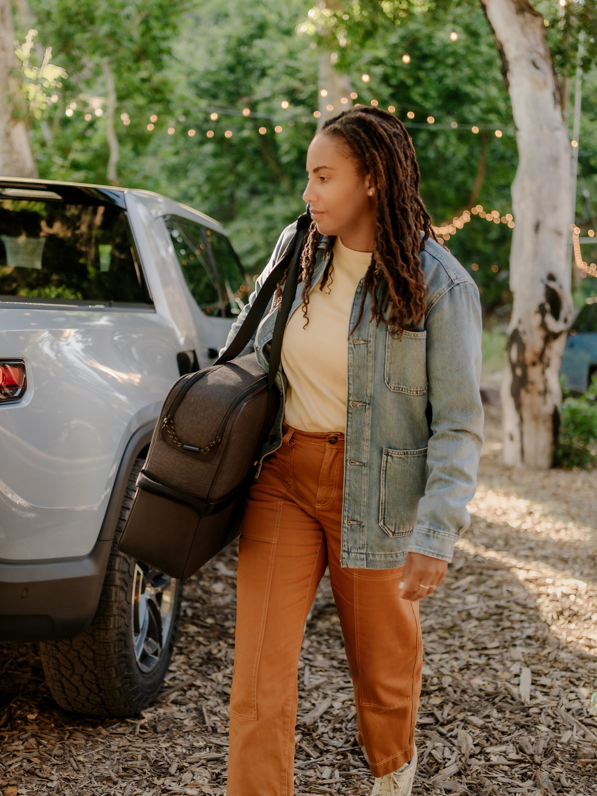 The Rivian Travel Kitchen is specially engineered for Rivian vehicles and fits on any tabletop surface that is within reach of a power source. It includes a carrying case, Hangout Lights and poles, a cutting board, and a drawer for storage of utensils.