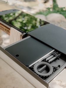 It also uses sustainable materials throughout to align with Rivian’s mission. The cutting board, for example, is made from recycled materials. The inside of the kitchen is also made from castor plants.