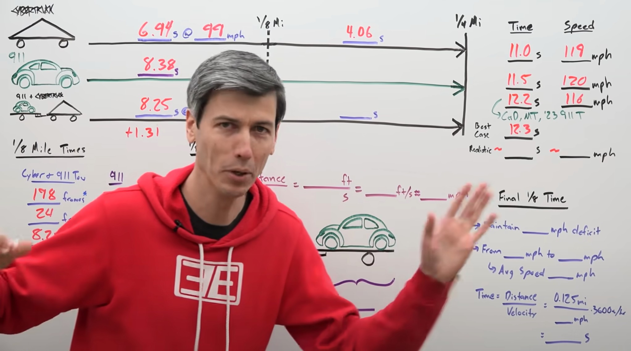 Fenske’s math shows that the Cybertruck would not be able to beat the Carerra 911 T in the 1/4-mile while towing a Carerra 911 T, like Musk said.