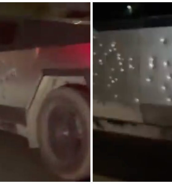 A video shared by a member of the Tesla Owners Club of Silicon Valley showed a Cybertruck driving down the highway with what appeared to be around 40-50 bullet holes in the driver’s side of the vehicle.